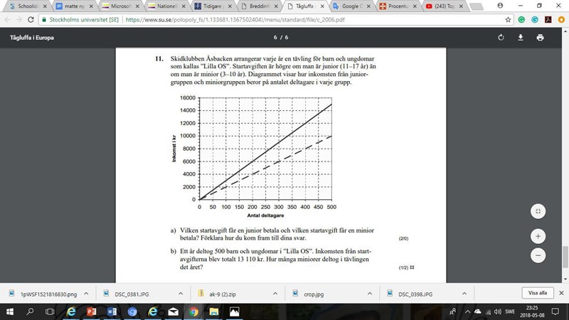 I uppgiften anges inte direkt vilket "streck" som representerar juniorer och vilket som står för miniorer men eftersom det står att startavgiften är högre för juniorer kan man anta att det tjocka strecket representerar juniorer.
