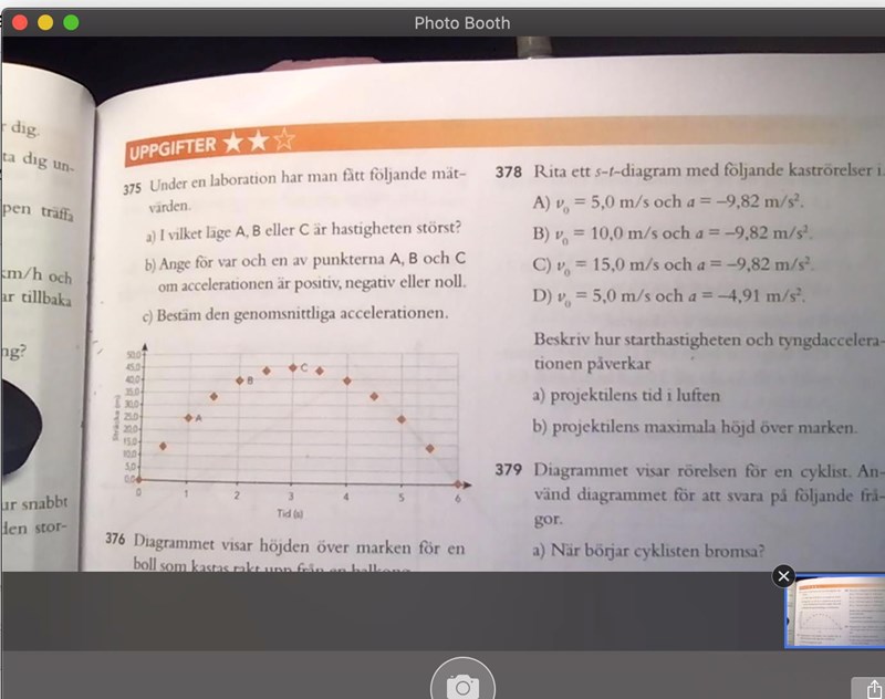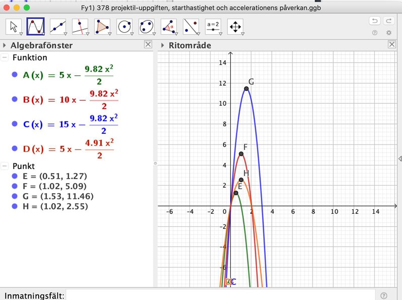 Hej! Jag håller på med uppgift 378 och har ritat graferna. Jag upptäckte att projektilen stannar i luften längre tid ju högre Vo är/ju lägre a är, samt att projektilens högsta läge är högre ju högre Vo är/ju lägre a är.
