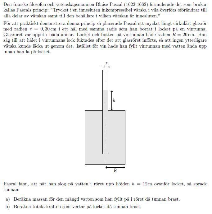 På uppgift a) har du förhoppningsvis kommit fram till att massan av vattnet i det tunna röret är .