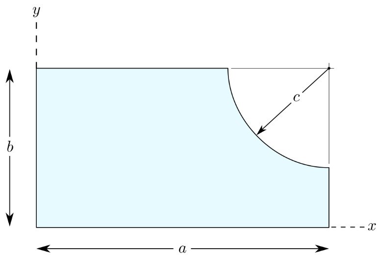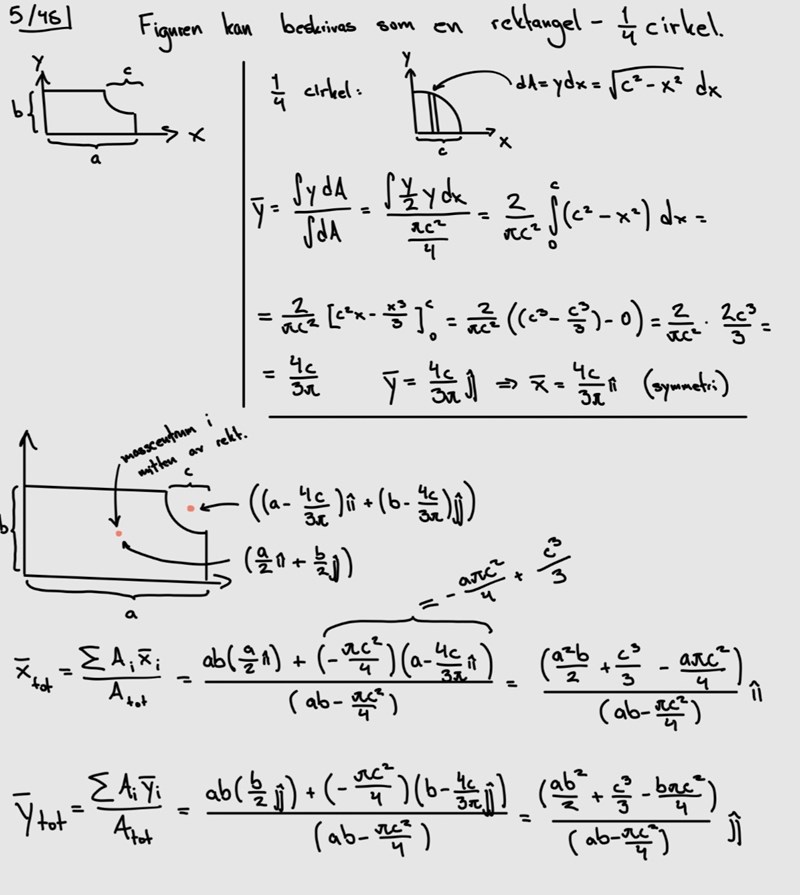 Jag tänker att man, för x-koordinaten, ska använda formeln , där M är massan av en rektangel med arean ab, m är massan av en fjärdedels cirkel med radien c och första och andra integralerna är integraler för ab-rektangeln respektive fjärdedelen av cirkeln. Tanken med denna formel är att man substituerar dm med dV, vilket sedan kan substitueras med ett uttryck som beror på dx. Därefter kan man genomföra integrationerna, och få en x-koordinat uttryckt i a, b och c.
