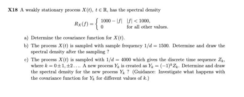 Jag förstår hur man ska beräkna a) och fick samma som i facit med hjälp av formler för fouriertransformer. När det kommer till b) förstår jag dock inte riktigt hur man ska tänka. Förstår att vi inte kan fånga upp någon frekvens större än 750 (1500/2 enligt Nyguist thm of frequency), men förstår inte varför den vid frekvens 500 planar av och är konstant i den nya spectral densityn. All hjälp uppskattas :)