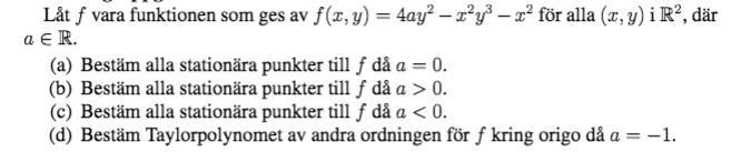 Hej! Jag försöker lösa denna uppgift men blir lite osäker. På a) har jag fått svaret "för alla y då x=0" men vet inte riktigt hur jag ska skriva detta som stationära punkter på korrekt sätt. På uppgift b) och c) får jag endast (0,0) som svar då övriga stationära punkter blir komplexa tal. Jag känner mig dock osäker på om jag har räknat rätt så skulle uppskatta hjälp.