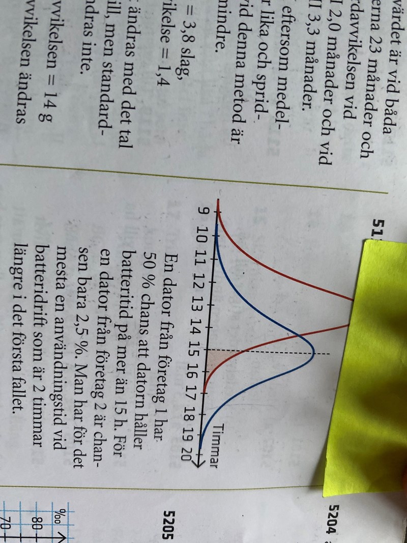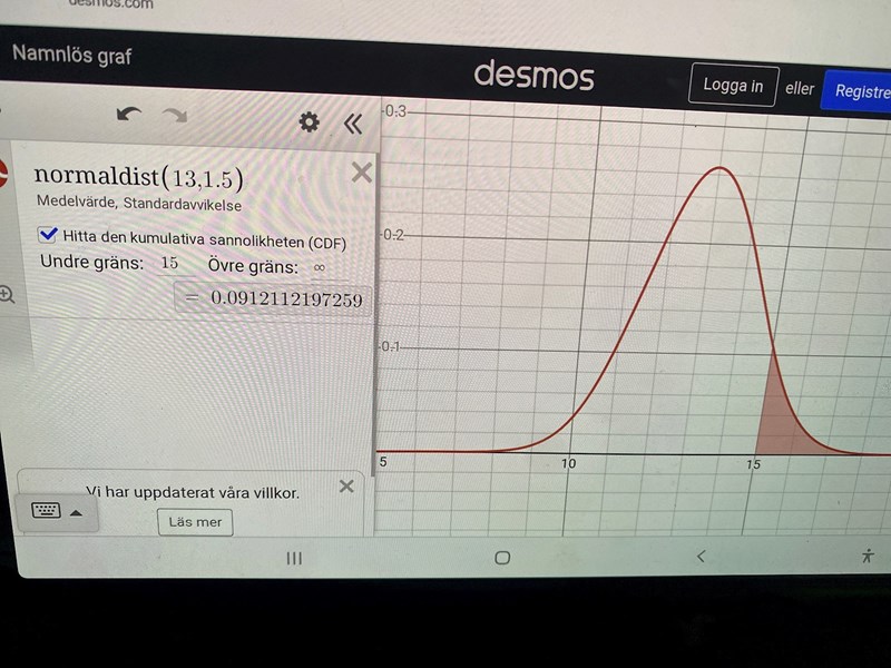 Enligt desmos är chansen att företag 2 håller en batteritid på mer än 15 timmar lika med 9% men enligt facit är det 2,5 %? Vilket stämmer?