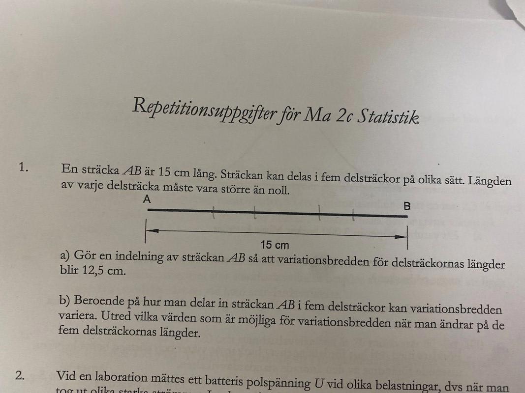 Notera att detta är en möjlig lösning, för det finns ett oändligt antal lösningar. Vi skulle kunna anta att b=c=d=a+0,1 vilket skulle ge oss att a+3(a+0,1)+e=15 cm och e-a=12,5 cm. Då har vi istället lösningarna a=0,44 cm och e=12,94 cm. Det är också en giltig lösning.
