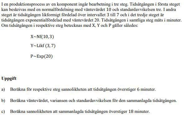 Uppgift b. Om tiderna , och är oberoende så beräknas variansen för den totala tidsåtgången som summan av de enskilda tidernas varianser.