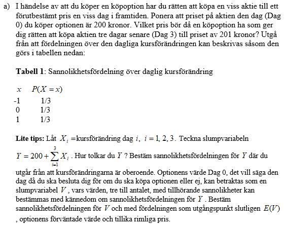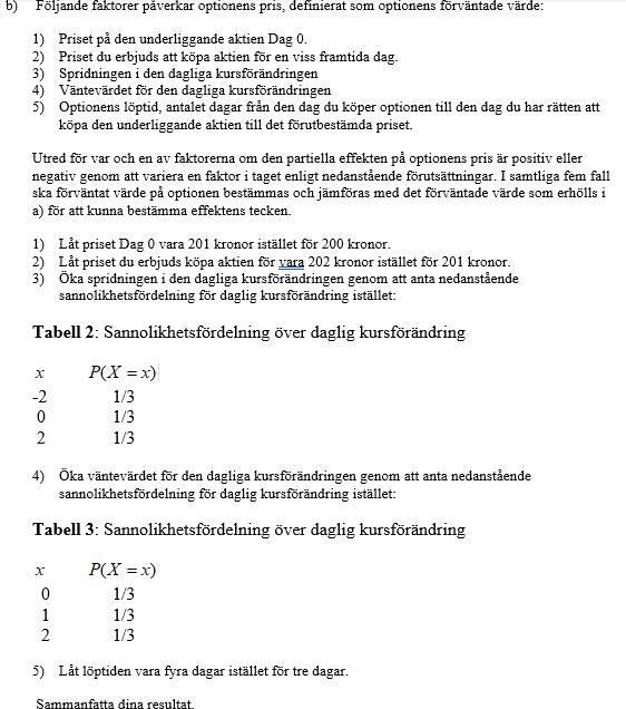 Har en uppgift som syftar till att ge förståelse för dels hur priset på en köpoption kan värderas med utgångspunkt från statistiska begrepp och dels vilka faktorer som påverkar värderingen.