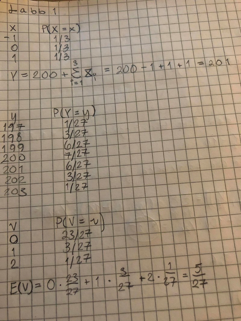 Okej, tack för all hjälp att bena ut uppgiften. Men sannolikheterna borde ju bli exakt samma? Dvs P(v=0) = 23/27 osv, spridningen är ju lika stor, bara förskjuten. Därför borde ju väntevärdet E(V) bli samma som i a)-uppgiften också.