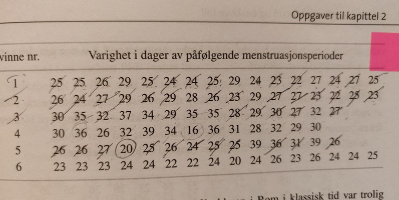 Jag behöver lite tips för att komma vidare i min uppgift som handlar om menscyklar. Jag ska ta reda på genomsnitt, median och standardavvikelse för varje kvinna. De första två löser jag men sedan fastnar jag på standardavvikelsen för varje. Jag har gjort lite olika uträkningar som är lite för kladdiga el fel för att lägga upp, jag behöver lite stöd hur jag ska gå vidare. Talen blir så konstiga. (enligt facit ska s=1,95 för den första kvinnan, 2,33 för andra kvinna, 3,32....5,69 )