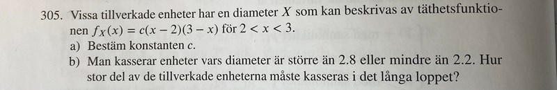 Integralen av fX(x) över hela intervallet ska bli 1.