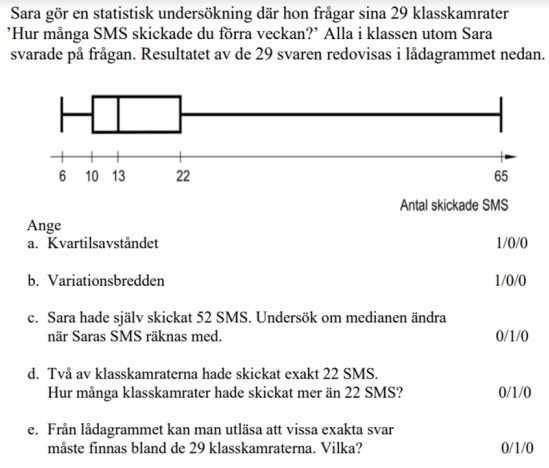 Men inte på d. Hur stor del av alla i klassen är det mellan 22 och 65 i lådogramet?