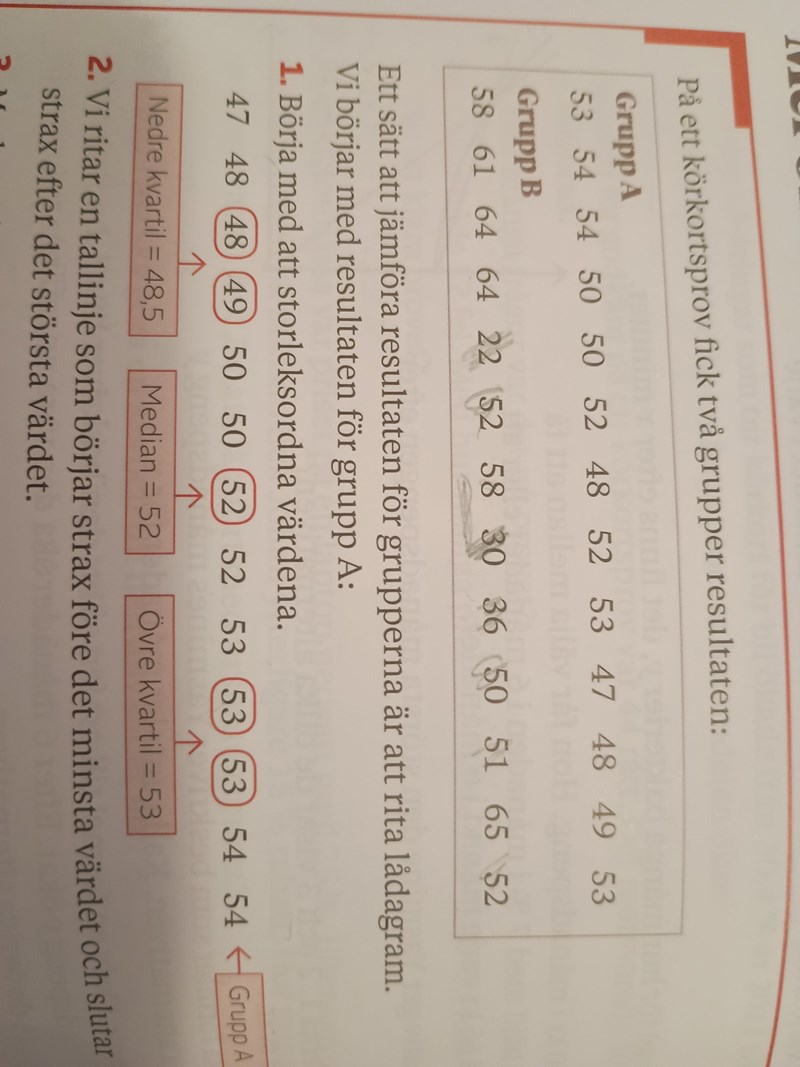 Då borde nedre kvartilen vara 50 och övre kvartilen vara 58? Men det står så i facit: