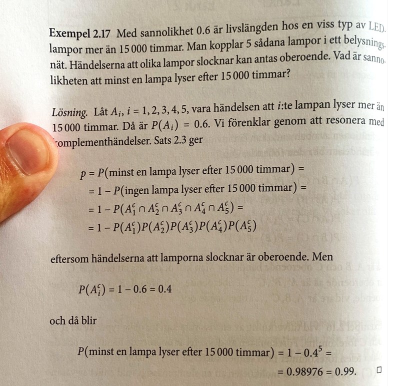 jag vet inte riktigt varför du får fel svar, det ser ut som att du tänkt rätt (även om du använt bokens notation A_i på ett annat sätt…). Men jag vet att du kan också räkna med komplementet. Hur räknar du ut binomialsannolikheten att ingen lampa lyser? Ser du likheten med facit svar då?