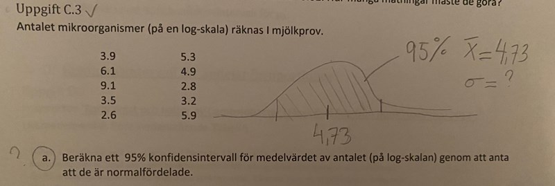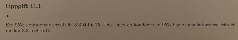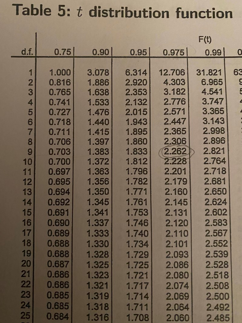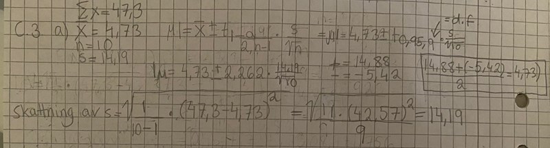Hej! Har totalt kört fast på denna relativt enkla uppgift då jag verkligen inte förstår hur facit kan stämma? De olika intervallen dividerat med 2 skall ju bli medelvärdet, vilket stämmer med min uträkning (se bild), så hur kan svaret i facit bli så? Jag har bifogat min uträkning, frågan, facit och tabellen för t-fördelningen där jag har ringat in aktuellt värde.