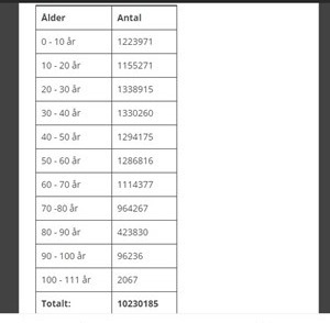 "I tabellen kan du se Sveriges befolkning i början av 2019 fördelad på olika ålderskategorier." Frågan är vad medianen, nedre kvartilen och övre kvartilen skulle vara (i år) i ett lådagram.