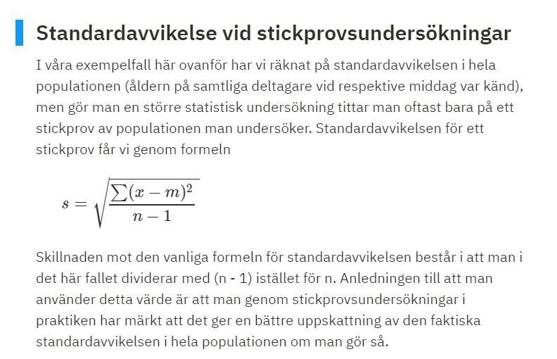 Från Matteboken om standardavvikelse, se nedan. Så i din uppgift gäller inte (n-1).