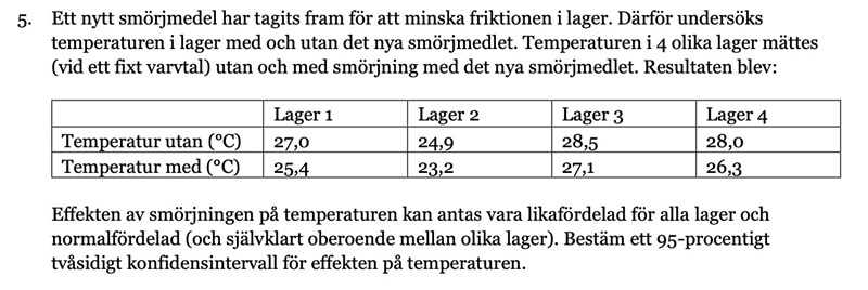 Du behöver alltså beräkna medelvärde och standardavvikelse för differensen mellan de två raderna i tabellen. Och bilda ett konfidensintervall för det.