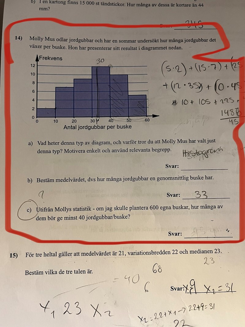 Det ser ut som att 10+5 = 15 av 45 buskar ger 40 eller fler bär per buske. Kommer du vidare härifrån?