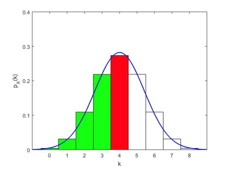 Vi approximerar här en diskret s.v. (för vilken P(X ≤ k) är skilt från P(X < k) för alla k = 0,1,...,n) med en kontinuerlig s.v. (för vilken P(X ≤ k) = P(X < k) för alla k = 0, 1, ..., n). Approximationen förbättras om vi använder så kallad halvkorrektion.