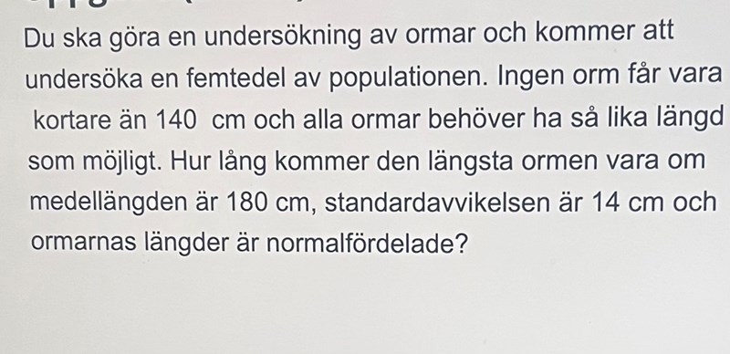 jag har stött på den här uppgiften och hur jag än tänker så fattar jag inte hur jag ska komma till lösningen. Jag förstår alla koncept i sig och jag kan tolka informationen men jag kan bara inte förstå hur jag ska sätta ihop det eller räkna för att få fram svaret. Jag förstår kvartiler, normalfördelning, standardavvikelse… osv men återigen jag förstår bara inte hur jag ska använda infon.