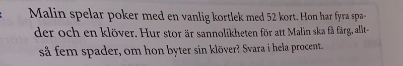 Malin slänger alltså sin klöver och tar ett kort från bordet. Hur stor är sannolikheten att det är en spader?