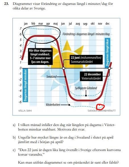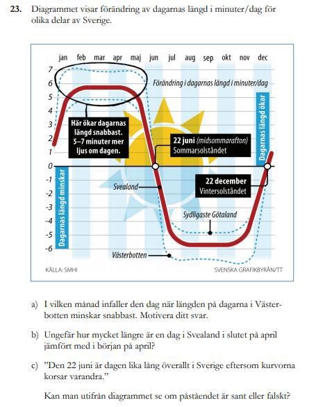uppgift b) där det står noll, kan jag anta att det är exakt 12 timmar dvs 720 minuter, alltså i slutet av april på Svealand är ca 725,5 minuter och i början på april är 726 minuter