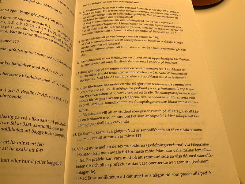 Jag skulle behöva hjälp med fråga 14 då jag inte riktigt förstår hur man ska tänka. Man borde kunna tänka att P(klarar minst en tenta)=1-P(missar alla tentor), men sen förstår jag inte hur man ska fortsätta. Jag har bland annat provat binomialfördelning men det blir inte alls rätt