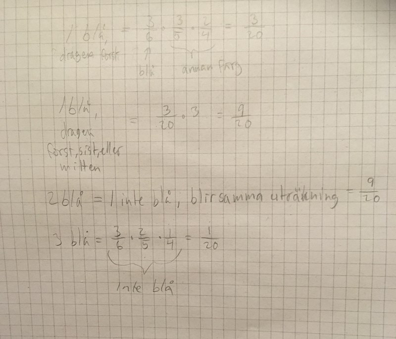 jag förstår att man kan göra det som 1 - P(ingen blå boll) men jag vill helst göra det genom att addera sannolikheterna för de olika gynsamma fallen