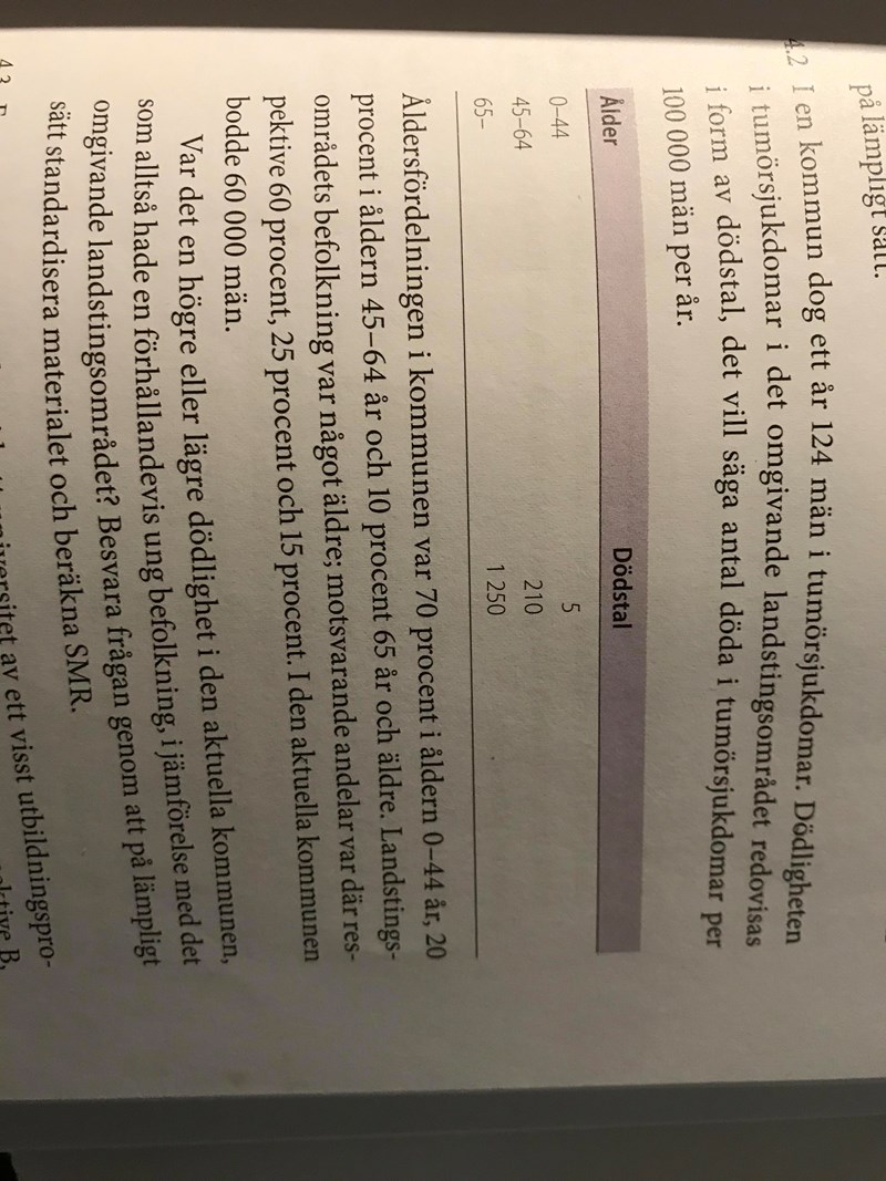 Var det högre eller lägre dödlighet i den aktuella kommunen, som alltså hade en förhållandevis ung befolkning, i jämförelse med det omgivande landstingsområdet+ Besvara frågan genom att på lämpligt sätt standardisera materialet och beräkna SMR (hela uppgiften finns på bilden).