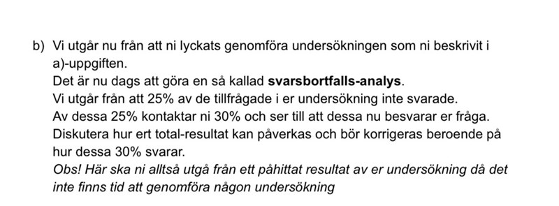 Hej behöver hjälp med en fråga. Jag har gjort en stickprovsundersökning i a) uppgiften, och har valt att tillfråga 10% av hela 100 000 personer. Alltså 10 000 personer. Sedan har jag påbörjat b uppgiften såhär: 0,25 x 10 000 =2500 som inte svarade. 0.3 x 2500 = 750 personer. Nu vet jag inte hur totalresultatet kan påverkas i samband med hur denna svarsbortsfall svarar