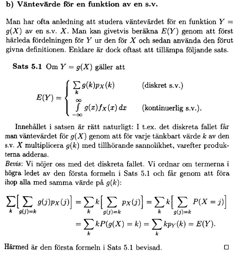 Om man ska beskriva detta med ord verkar det som om man i sats 5.1 fokuserar på att addera ihop sannolikheterna dvs sannolikheterna då X antar värdena k multiplicerat med värdet g(k), medan i beviset i den inre summationen verkar man istället addera ihop sannolikheterna , men där j är sådant att g(j) = k uppfylls, och multiplicerar detta med g(j) = k.