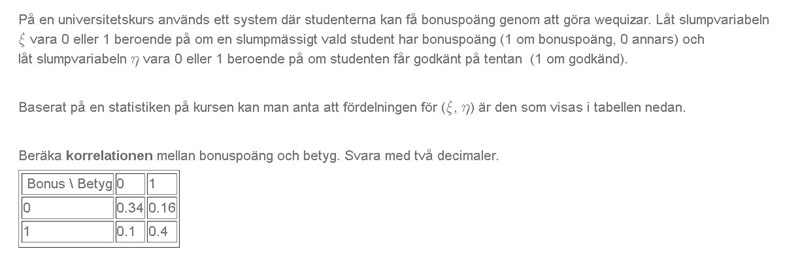 Matematik / Universitet 0 svar 64 visningar pepsi1968 538 Postad: 20 okt 2022 18:32 Statistik varians Hej hej! Vi vet att: p(ξ1,ξ2)=Cov(ξ1,ξ2)σ1σ2. Men också att för kontinuerliga stokastiska variabler gäller det att: Cov(ξ1,ξ2)=∫∫R2x1x2f(x1,x2)dx1dx2-μ1μ2. För att vi uppenbarligen har en diskret fördelning kan vi ersätta integralerna med summor.Härifrån tappar jag mig själv hur ska jag ersätta och vad blir det? Användare skriver Svara Du behöver Logga in eller Bli medlem först! Avbryt