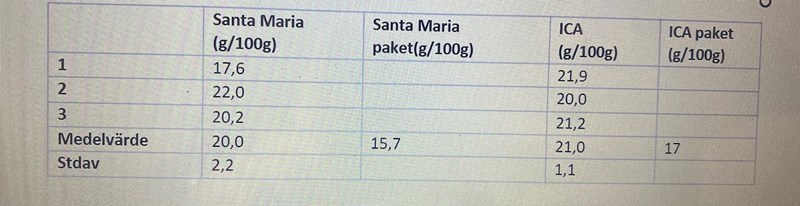 Det verkar vara största och minsta värde för de sorter där man har gjort tre mätningar. Vad är staplarna där det inte finns några streck - är det fler varianter av något där ni bara gjorde en mätning, inte tre, eller är det något värde som stod på paketen? Om det är den sista gissningen som stämmer, skulle jag vilja påstå att båda sorterna innehåller för mycket salt jämfört med innehållsförteckningarna. Och 17 (eller 15,7) g salt per 100 g är jättemycket - gissningsvis är det en kryddblandnig, inte något som är avsett att ätas som det är.