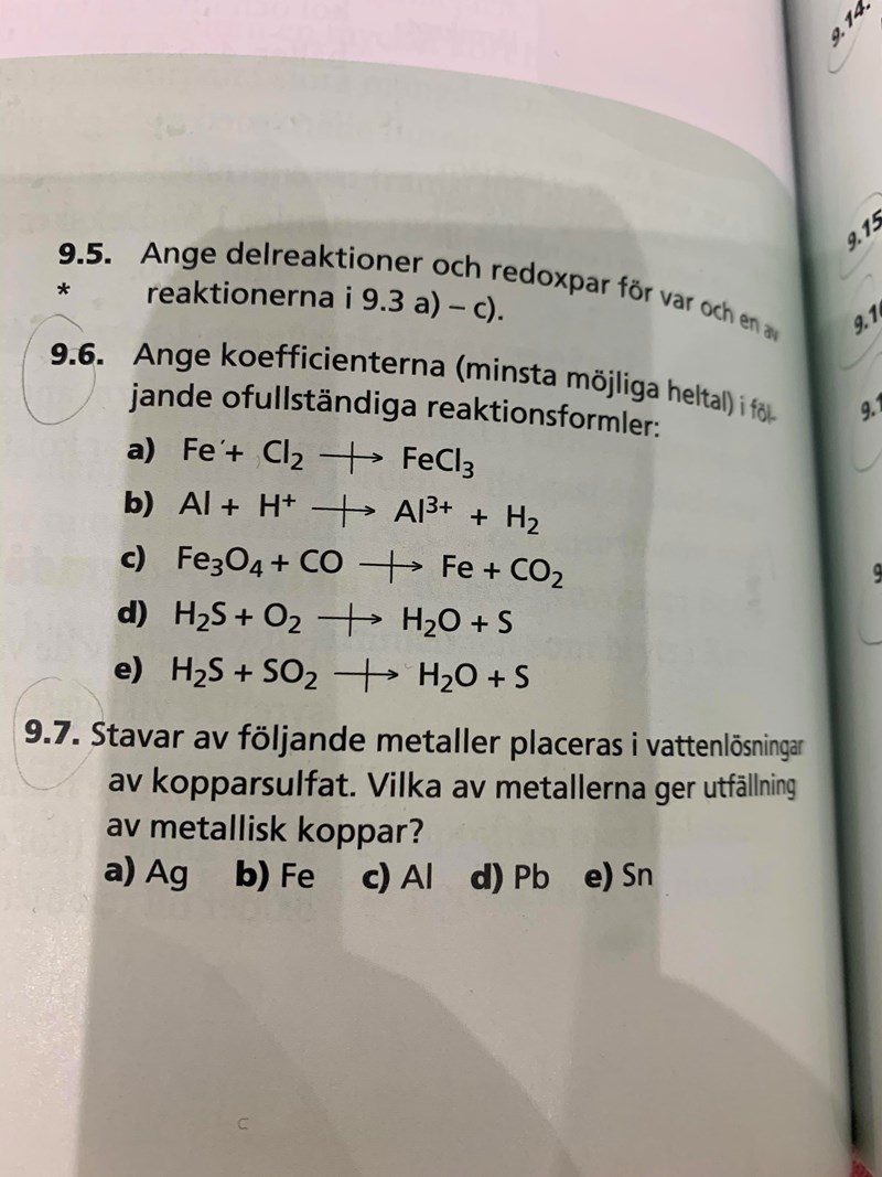 9.7 det står vilka av metallerna ger utfällning av metallisk koppar. Då måste de vara någon ädel metall tänker jag?  För dom tar inte emot fler elektroner då blir det en utfällning men de är fel det ska vara a,b,c,d jag undrar varför?