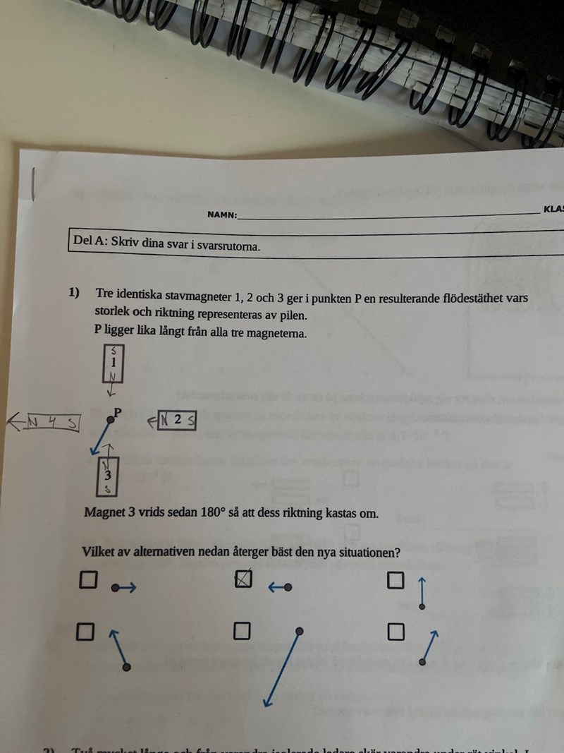 och jag undrar om vi ska beräkna resulterande så tänker jag att stavmagneten uppe och nere har motriktade magnetfält så de tar ut varandra sedan har vi resulterande magnetfält åt vänster?