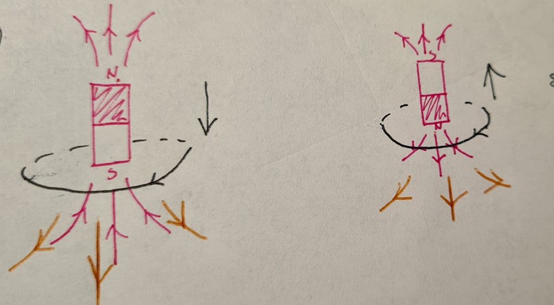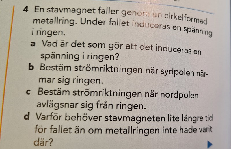 Har fastnat på c uppgiften... Lösningen till b har jag ritat upp till vänster och lösningen till c är till höger. För att motverka förändringen när magnet avlägsnar sig borde ett fält bildas med samma riktning om magnetens och därför borde strömriktningen bli såsom i figuren. Men facit säger att det är tvärtom vilket jag inte förstår :(