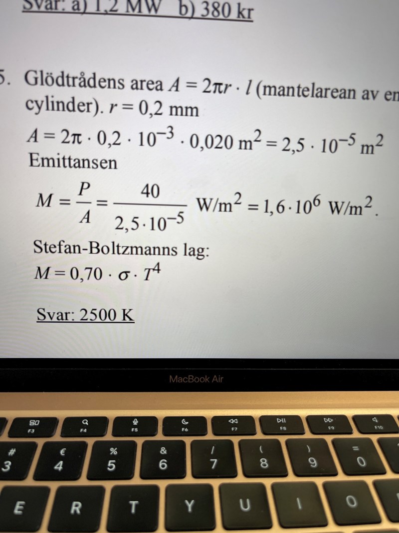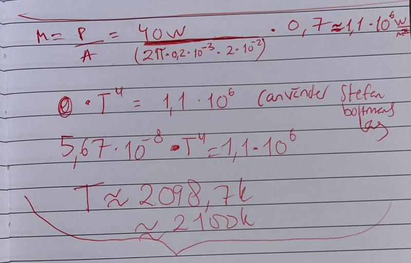 M= 0.7 * (P/A) , detta satte jag därefter lika med Stefan-boltzmanns lag och löste ut T . Varför är det fel att göra som jag gjort? (se gärna min uträkning ovan )