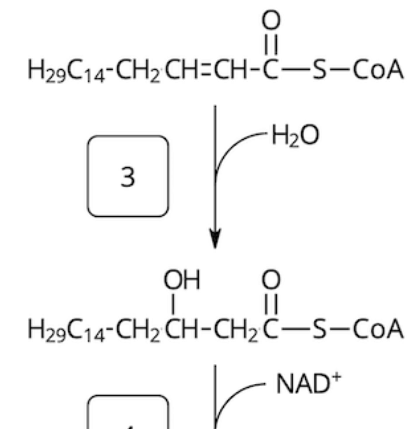 Skulle du t.ex. i en glaskolv hetta upp acyl-CoA (högst upp) med vatten till hög temperatur, skulle istället endast bindningen mellan C-S brytas, då vatten adderas och CoA-SH lämnar. Parallellt med den reaktionen, kan många andra reaktioner ske, t.ex. addering av vatten till dubbelbindningen (och denna gång domineras bildningen av produkt, av vilken reaktion som har lägst aktiveringsenergi).