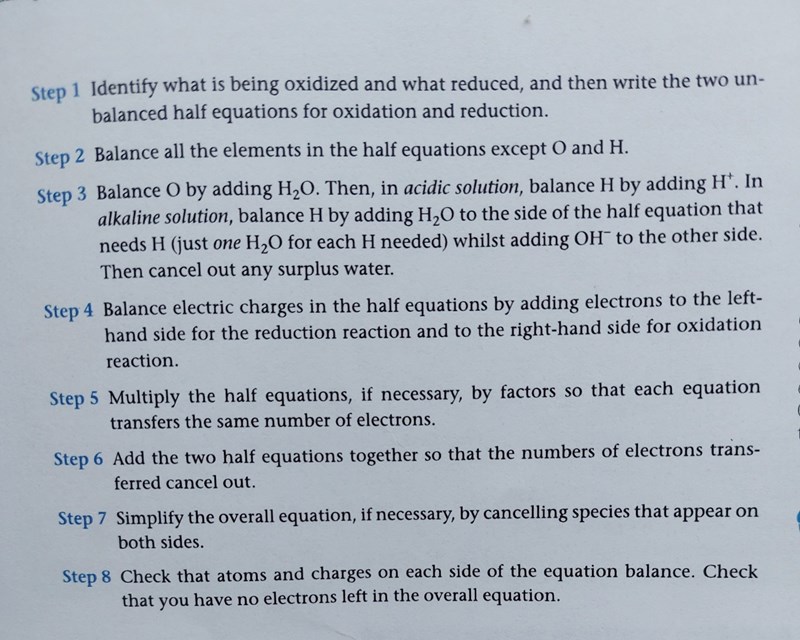I min kemibok står följande steg för steg lista för hur man kan skriva en balanserad redoxreaktionsformel från halvformler. Jag undrar över steg 3. Finns det någon mer utförlig förklaring till varför man gör detta steget och olika steg beroende på om det är en sur eller basisk lösning?