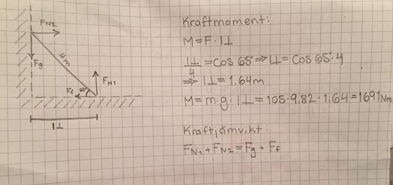 Okej, nu har jag fixat till det lite. Om jag har räknat rätt så borde kraftmomentet då bli 1691Nm. Hur ska man bilda ekvationer av det hela?