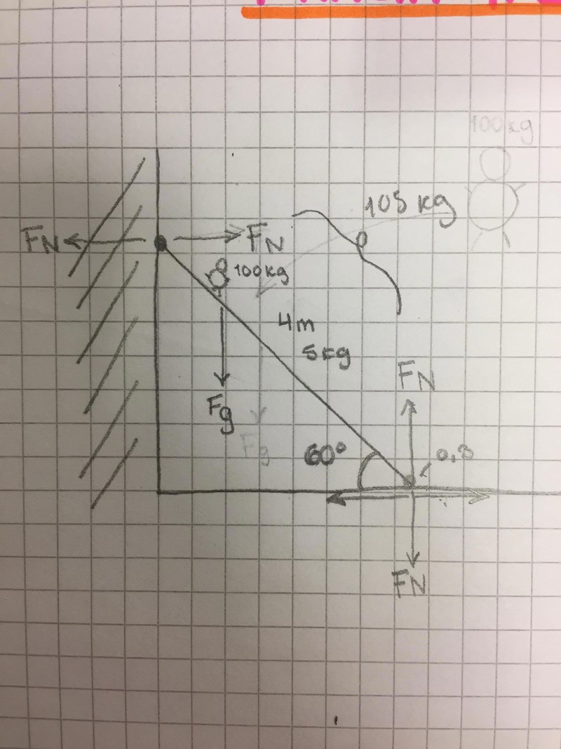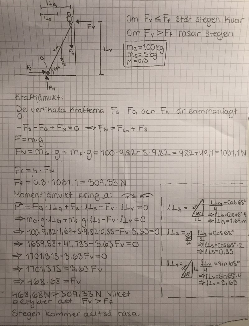 Nu får du bilda ekvationer för kraftjämvikt och kraftmoment. Det är bra om inte alla krafter heter samma sak, för de är nog inte lika. Det stod 65 grader i frågan också.