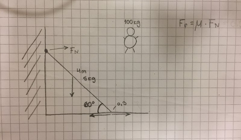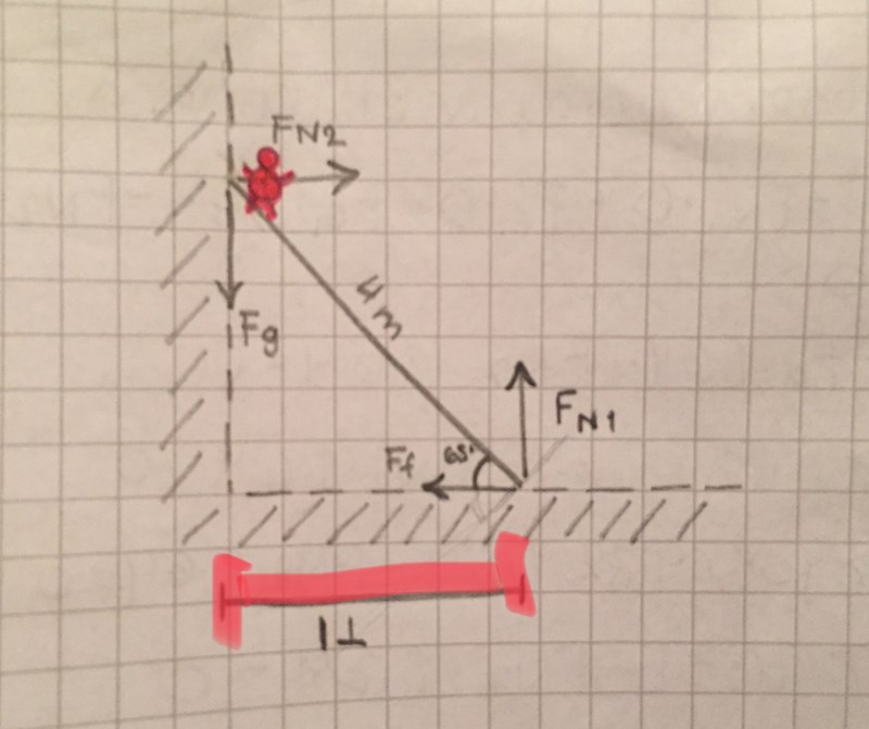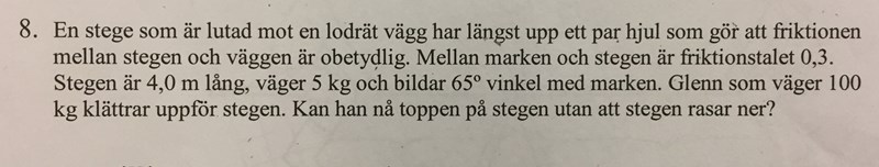 Det som hindrar vänsteränden av stegen att glida neråt är att den högra änden av stegen inte glider iväg åt höger. Det är friktionskraften som "håller emot". Hur stor är den friktionskraften (det beror på var Glenn står). Hur stor är kraften som "vill" trycka högeränden åt höger (det beror också på var Glenn står). Vid vilken Glenn-placering är dessa krafter lika? (Om Glenn går längre än så åt vänster kommer stegen att glida iväg.) Alternativt - kolla om stegen glider när Glenn står överst på stegen.