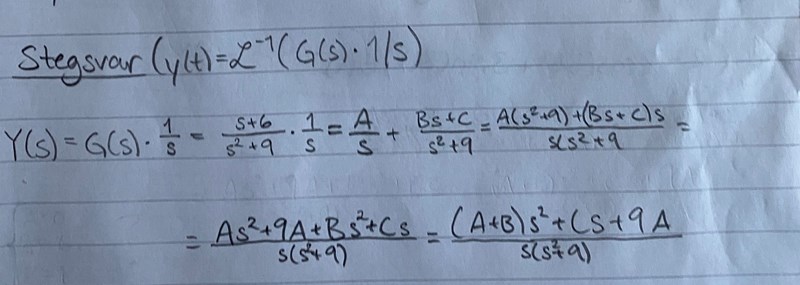 Jag har lösningsförslag på impulssvaret men fastnar när jag ska komma fram till stegsvaret och hoppas på hjälp där. Nedan visas bild på mina beräkningar.