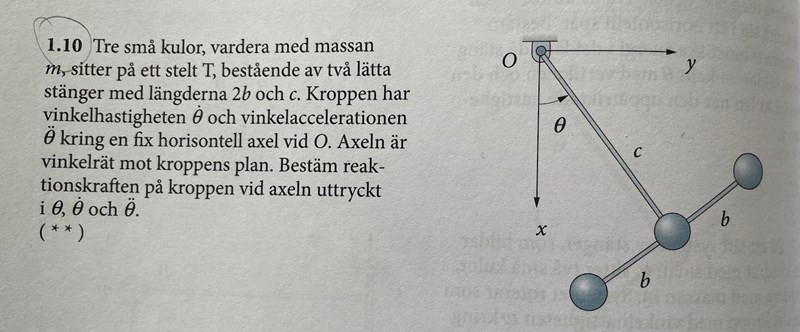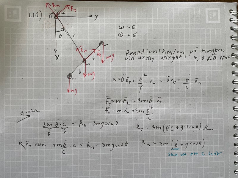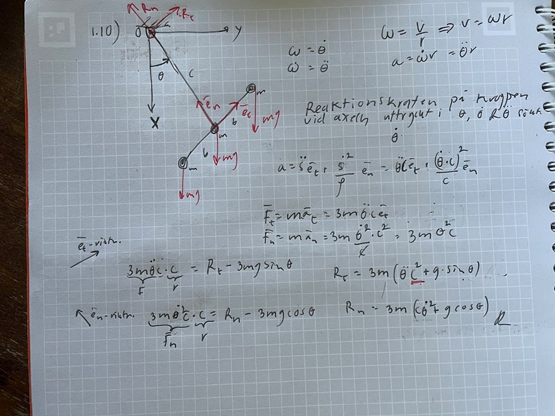 På denna uppgiften undrar jag vad som har gått snett. Jag saknar ett c i svaret för . För att få fram krafterna har jag använt mig av de två olika komponenterna i det naturliga koordinatsystemet för de två olika riktningarna.