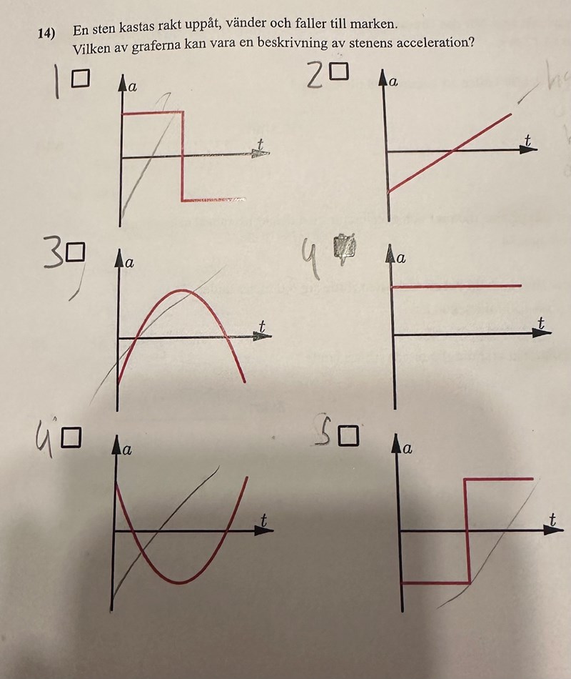 1 och 5 är inte rätt då acceleration ändrar riktning