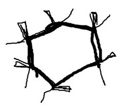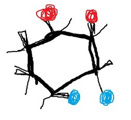 Du har en ring som består av 6 kolatomer med enkelbindningar mellan, så varje kol binder även till två väteatomer. Jag ritar en förenklad variant där kol-ringen är platt, det är den inte i verkligheten. Ser du att det finns bindningar som pekar uppåt från ringen (trianglar) och bindningar som pekar neråt (tunna linjer)?