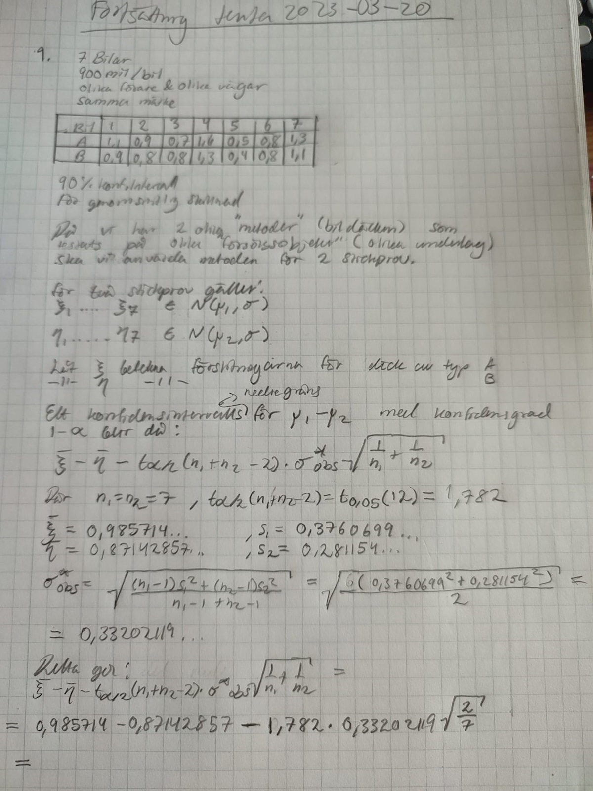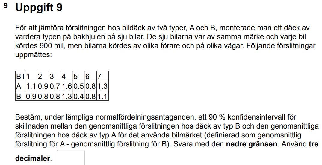 Hej! I facit säger de att de valt att använda metoden för stickprov i par då det är samma typ av bil (samma märke) men jag tänkte att det inte borde spelat någon roll vilket märke det är då de använt två olika sortes däck (så två "metoder") på ollika "försöksobjekt" (olika underlag). Så jag använde metoden för två stickprov som då blev fel:( Har ni något tips på hur man kan völja rätt metod?