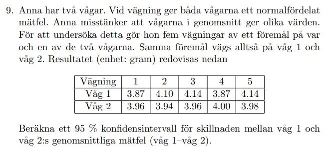 Hej! Jag tycker det är svårt att veta när man ska använda stickprov i par och två stickprov? Jag tyckte att stickprov i par skulle användas för den här uppgiften eftersom vi hade 5 observationer som testades på två olika vågar. Jag tycker detta var likt ett exempel i boken där de använde stickprov i par när det var prover som togs under en serie dagar och två olika metoder användes. Jag tänkte att i detta fall var föremålen som antalet dagar och de två olika vågarna som de två olika metoderna om man jämför med bokexemplet. Även om jag läst både deras motivation i facit till varför man ska använda metoden för två stickprov samt det som skrivits i boken förstår jag inte varför denna uppgift skulle använda metdoen för två stickprov? vad skiljer sig detta från exemplet?