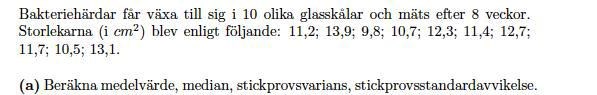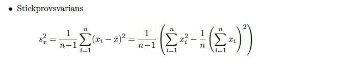 Dels har du fel värde på n, dels har du missat de tre sista mätvärdena. Och ska du ha variansen så ska du inte ta kvadratroten.