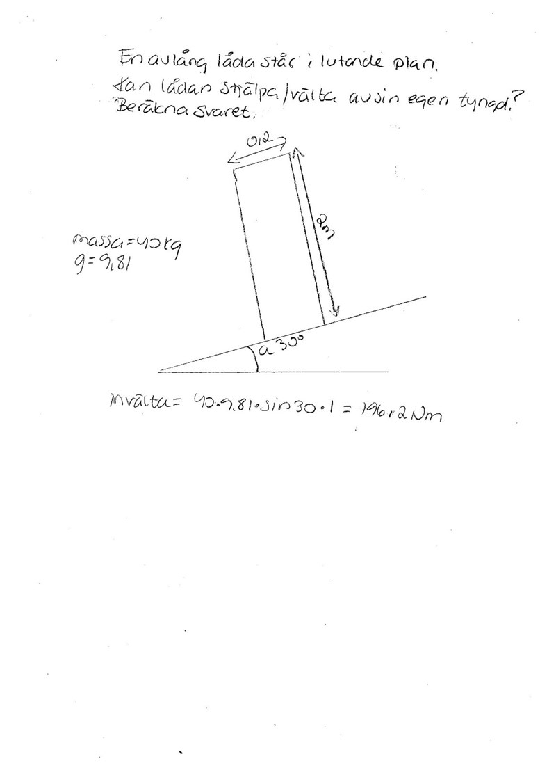 Alltså delar du upp tyngdkraften i komposanter och beräknar det stjälpande momentet minus det stabiliserande momentet kring nedre vänstra hörnet (alltså där lådan kan välta kring).
