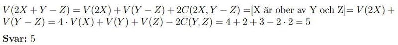 Jag är nog med på att V(2X+Y-Z)=V(2X)+V(Y-Z) eftersom man kan dela upp varianserna om vokalerna är oberoende (här är X oberoende av Y och Z). Men sedan förstår jag inte hur 2C(2X,Y-Z) kommer in i bilden. Vad är det för samband som används?